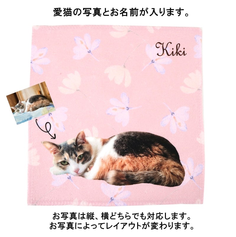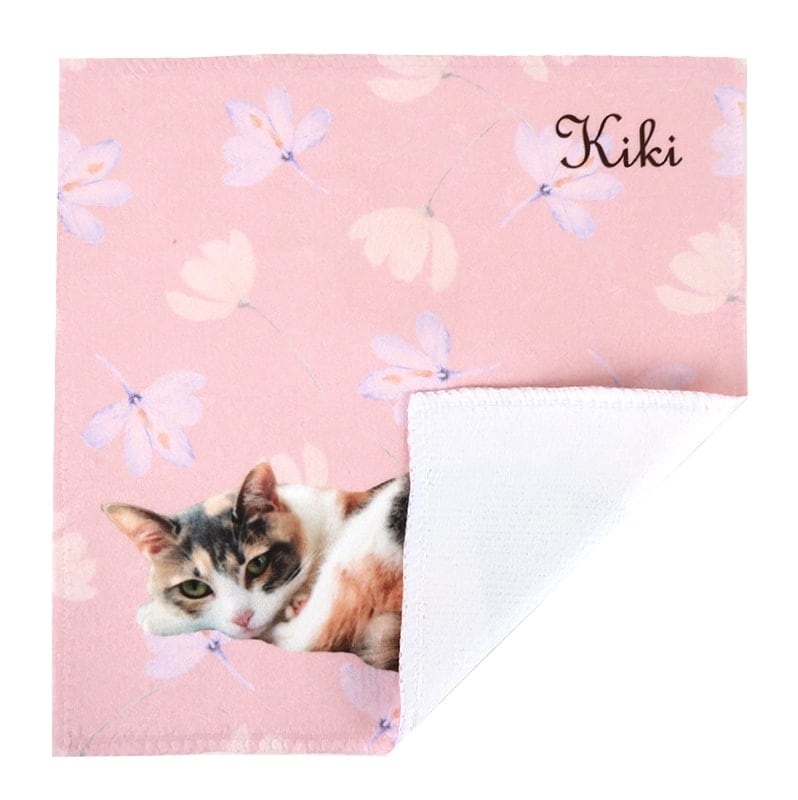 愛猫の写真とお名前が入るオーダーメイドのタオルハンカチです。