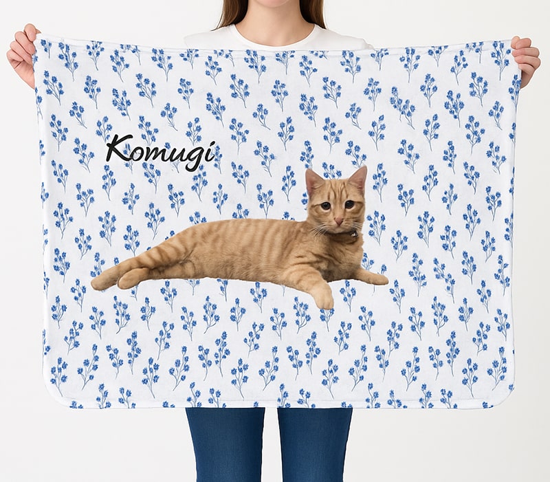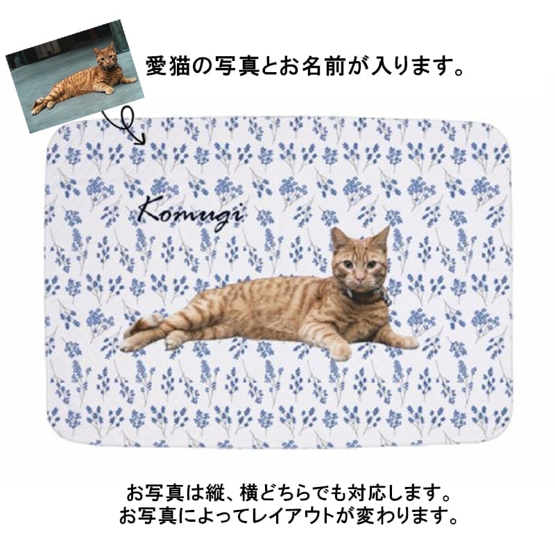 愛猫の写真とお名前が入るオーダーメイドの冷感ブランケットです。一枚ずつお写真を切り抜いて加工します。