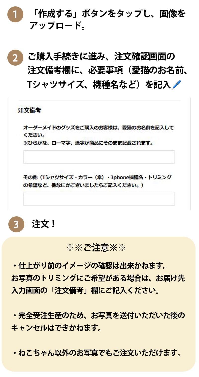 ①Tシャツのサイズ②愛猫のお名前を注文確認画面の「注文備考」欄に入力してください。